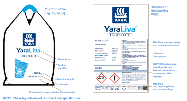 Poreklo proizvoda uvek je navedeno na vreći. Prednja strana svake Yarine vreće, i velike i male, obeležena je za potrebe transporta (TDG etiketa). Zadnja strana velikih i malih vreća uobičajeno sadrži etiketu u skladu sa CLP i TDG regulativama. Koristimo kombinovane etikete, osim u sledećim slučajevima: